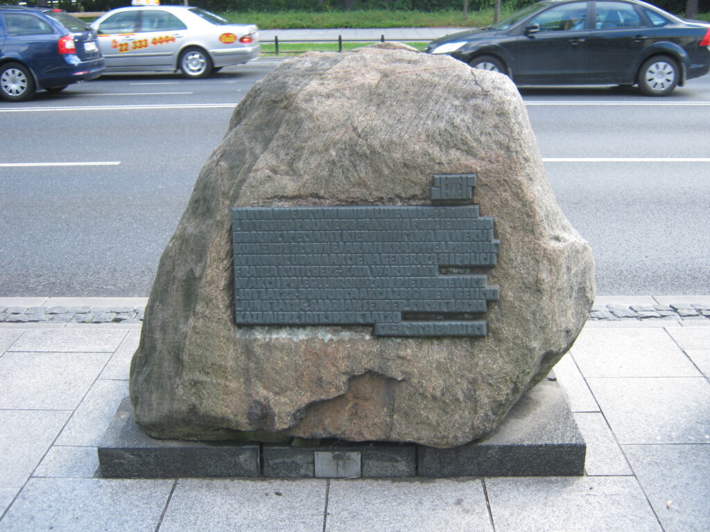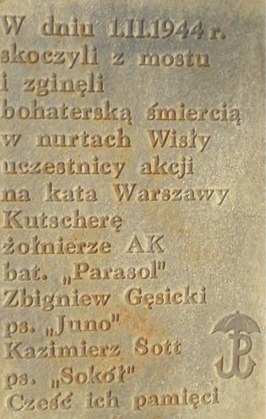 - Placa que recuerda el lugar donde saltaron al río Vístula los soldados de la Resistencia Polaca.‘’El día 1/2/del año 1944, saltaron desde este puente y fallecieron herocicamente en las correientes del Vístula, los soldados del A.K. (Resistencia Polaca), del batallón „Parasol” Zbigniew Gesicki (seudónimo „Juno) y Kazimierz Sott (seudónimo „Sokól”), quienes participaron en la acción contra el Verdugo de Varsovia Kutschera. Honremos sus memorias’’.