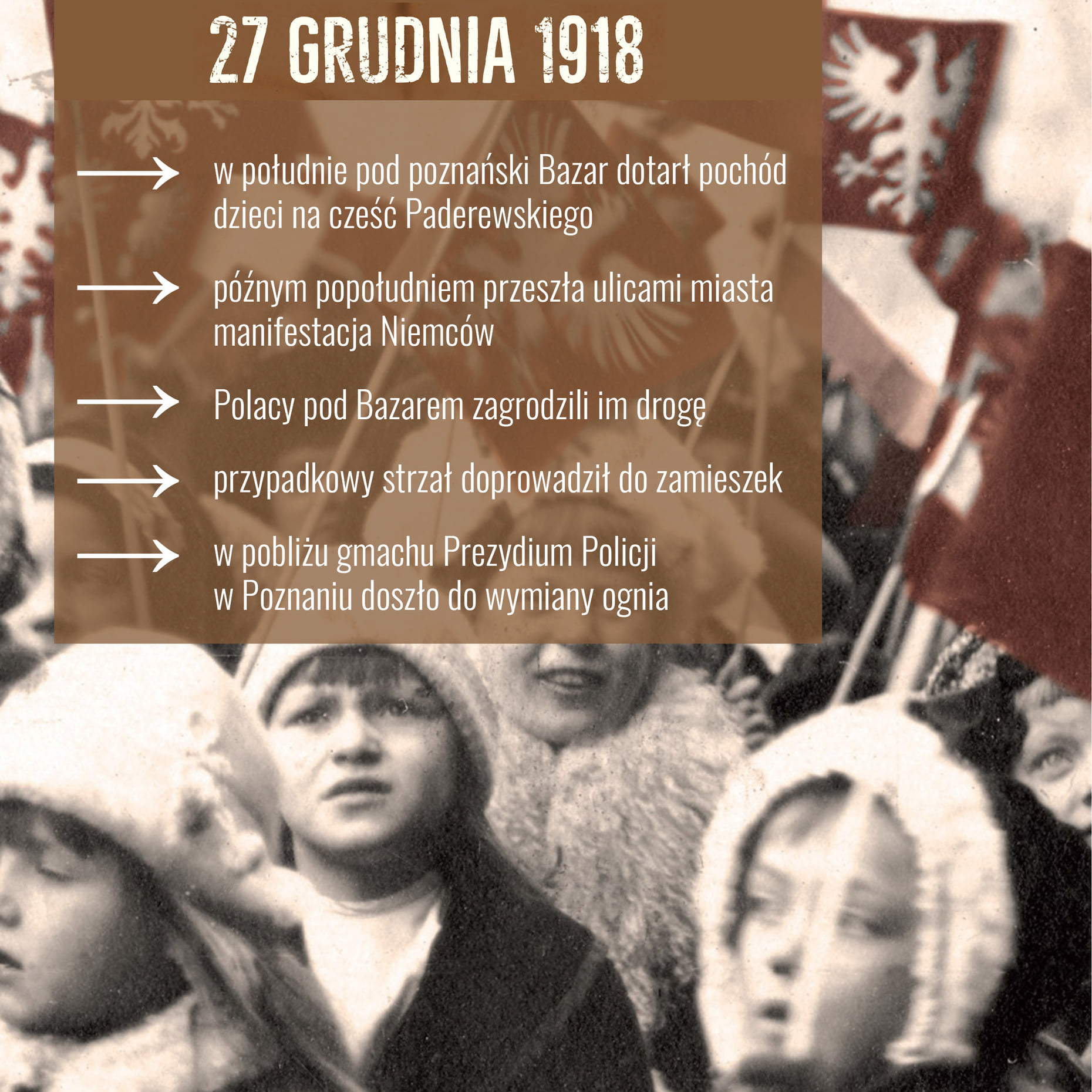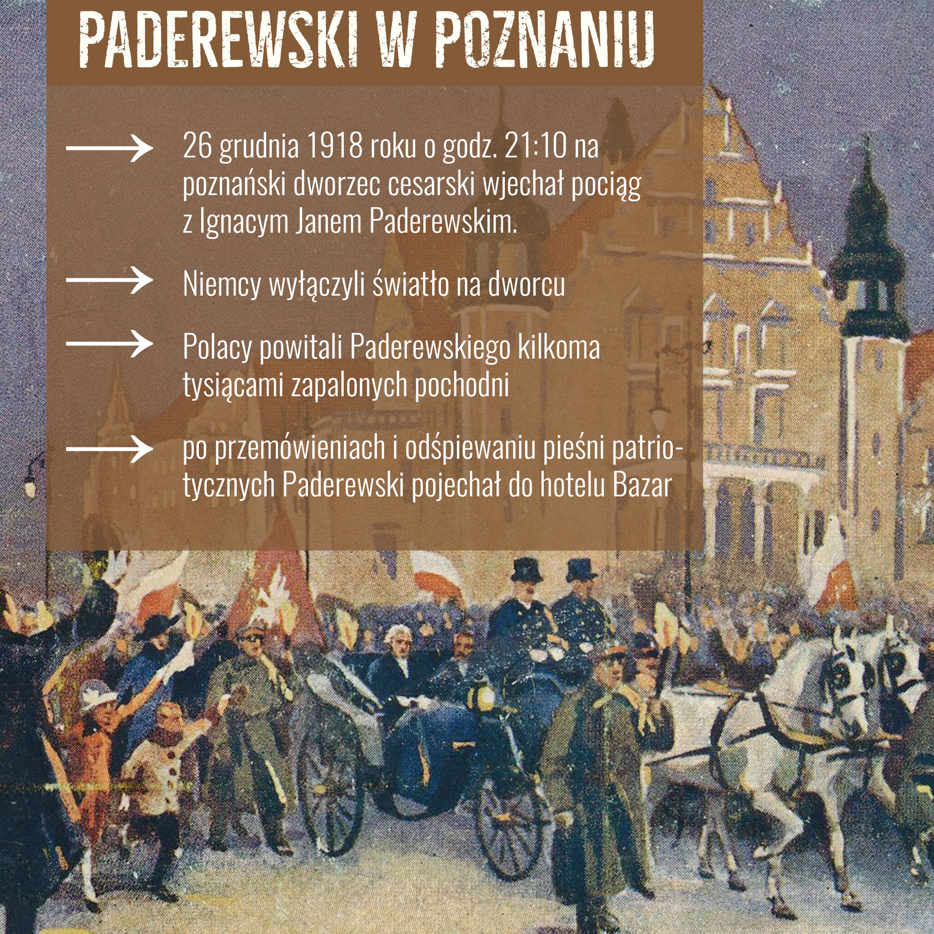 El 26 de diciembre de 1918 a las 21:10 el tren que traía a Ignacy Jan Paderewski entró a la estación imperial de Poznań. Los alemanes apagaron la luz de la estación. Los polacos dieron la bienvenida a Paderewski con varias miles de antorchas encendidas. Después de los discursos y las canciones patrióticas Paderewski se dirigió al hotel Bazar.