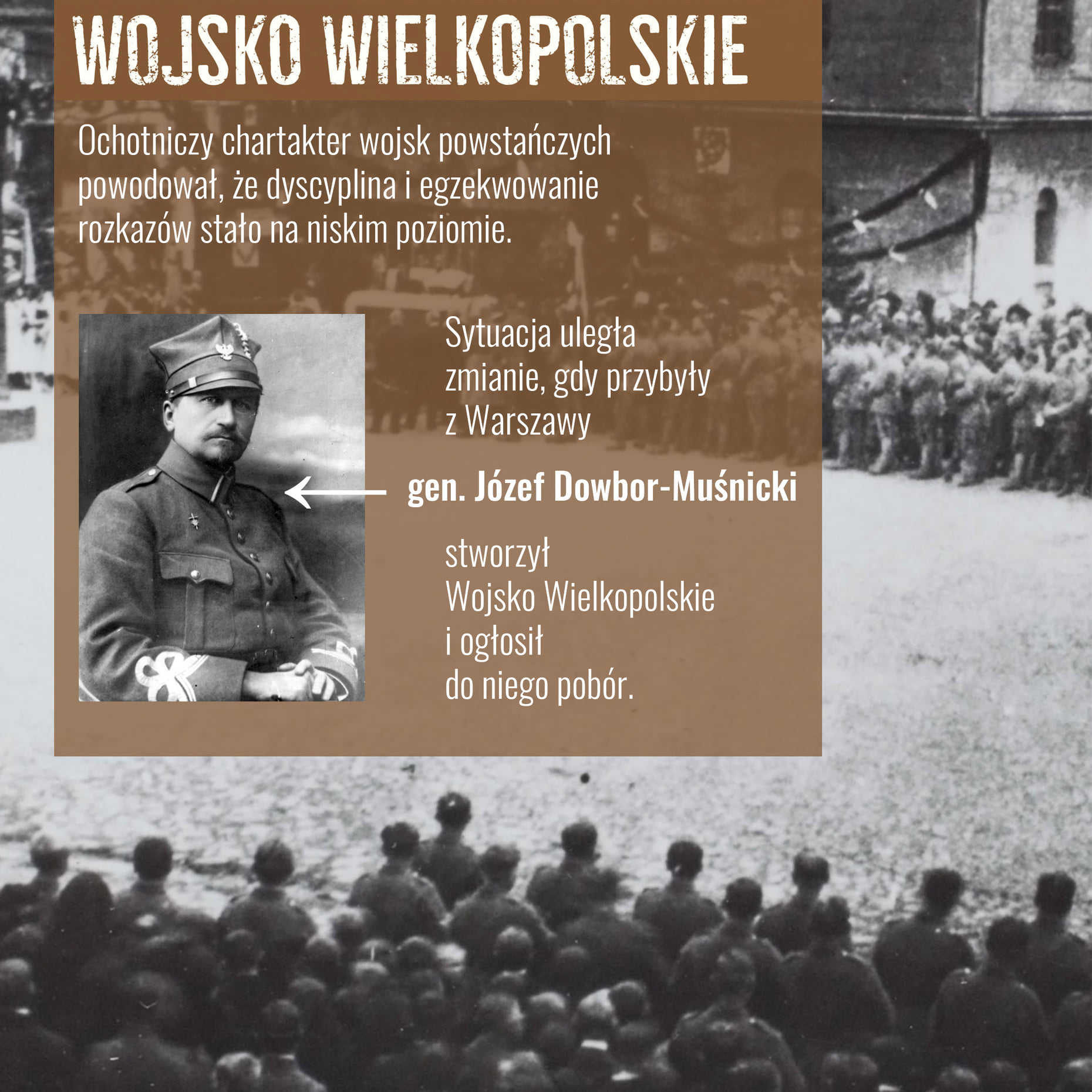 El carácter voluntario de las tropas insurgentes hizo que la disciplina y el cumplimiento de las órdenes fueran de bajo nivel. La situación cambió cuando el general Józef Dowbor-Muśnicki, que venía de Varsovia, creó el ejército de la Gran Polonia y anunció su reclutamiento.