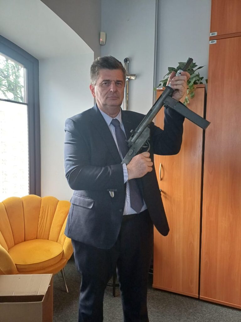- El autor de la nota Ing. Andrés Chowanczak portando la Pistola Ametralladora Błyskawica