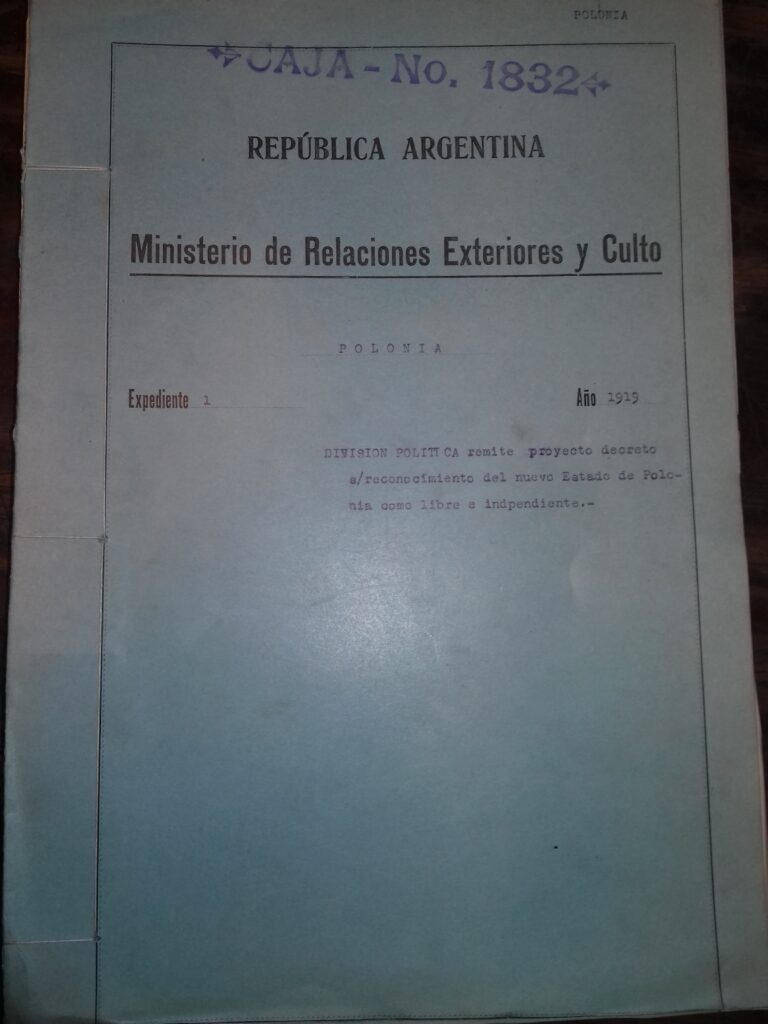 - Caja con número 1832. REPÚBLICA ARGENTINA. MINISTERIO DE RELACIONES EXTERIORES Y CULTO. POLONIA. Carpeta con número de Expediente 1. DIVISIÓN POLÍTICA: proyecto decreto s/reconocimiento del nuevo Estado de Polonia como libre e independiente.
