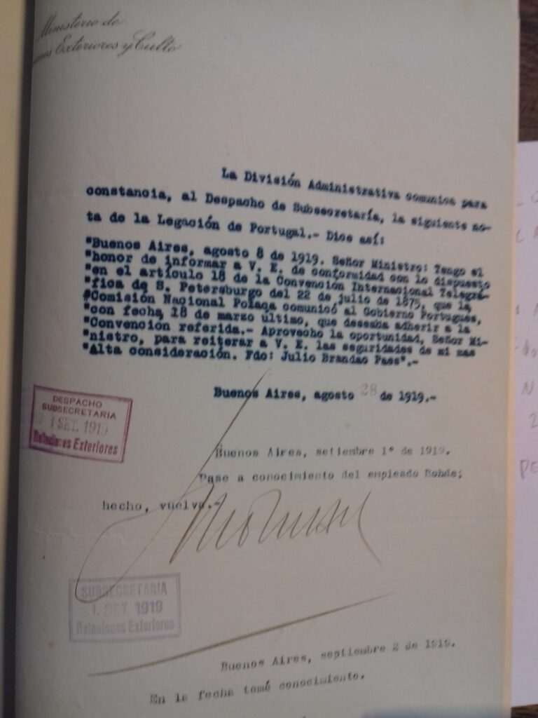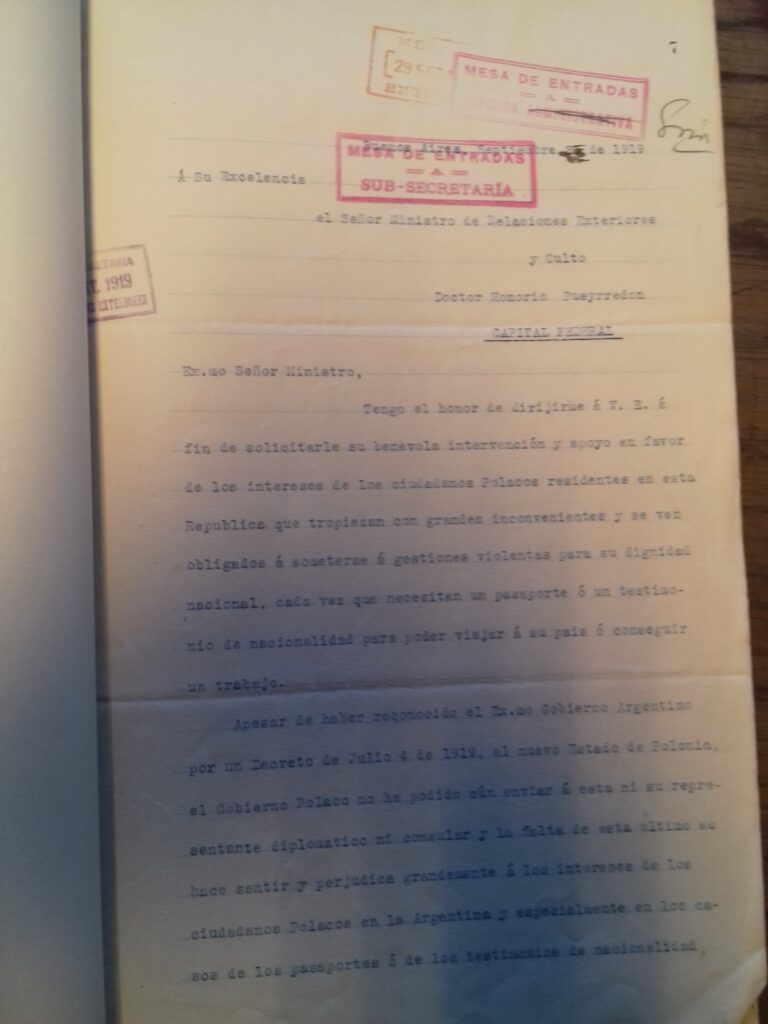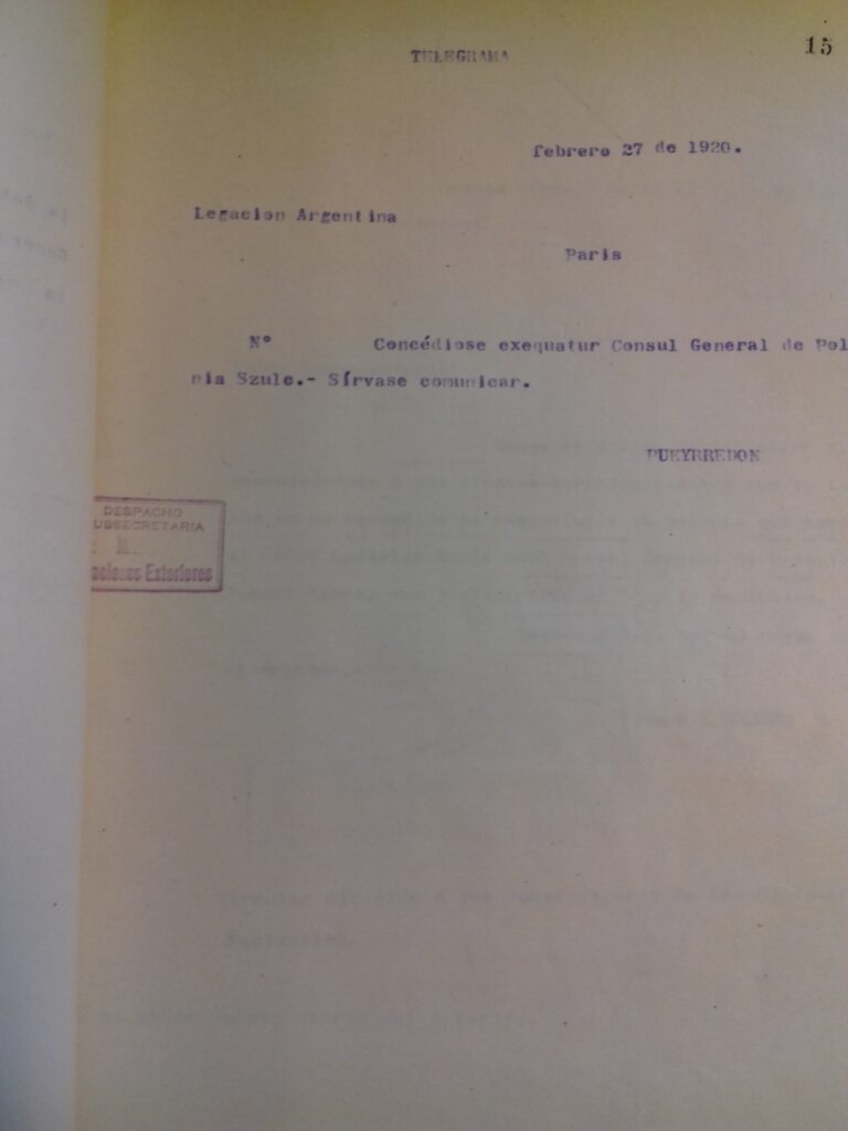 “TELEGRAMA octubre 23 de 1919. Legación argentina Paris. Súbitos polacos hanse dirigido Ministerio solicitando tener representante consular pues no existe autoridad que pueda visarles pasaportes etc. Se ha prometido ayuda en el sentido de interesar gobierno polaco en nombramiento algún agente consular aun honorario a cuyo efecto diríjome a V. E. . PUEYREDÓN”. (2).