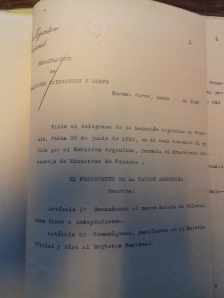 ‘’Visto el telegrama de la Legación Argentina en Francia, fecha 20 de junio de 1919, en el cual transmite el pedido que, al Gobierno Argentino, formula el Presidente del Consejo de Ministros de Polonia