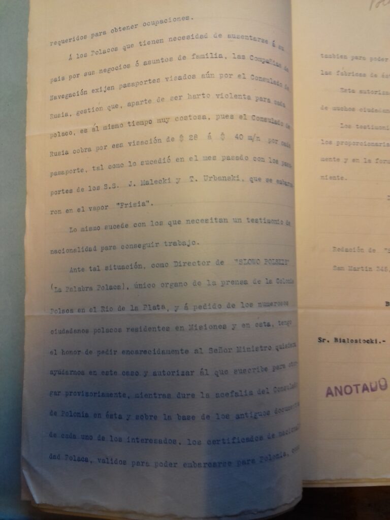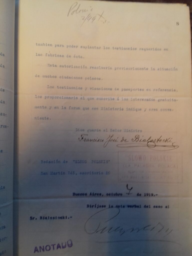 - Nota con fecha de 20 de septiembre de 1919 del Sr. Francisco José de Bialostocki Redactor del Periódico Polaco Slowo Polskie dirigida al Sr. Ministro de Relaciones Exteriores y Culto Dr. Honorio Pueyrredón.
