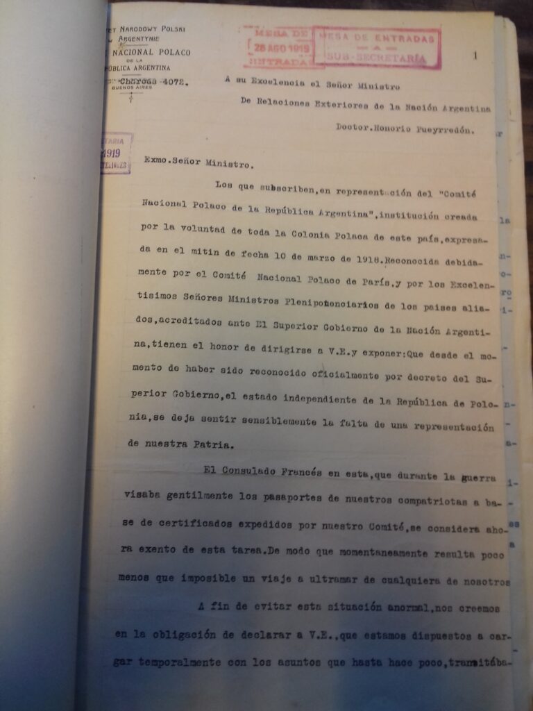 - Nota con fecha de 25 de agosto de 1919 del Comité nacional Polaco dirigida al Sr. Ministro de Relaciones Exteriores y Culto Dr. Honorio Pueyrredón. Hoja 1.