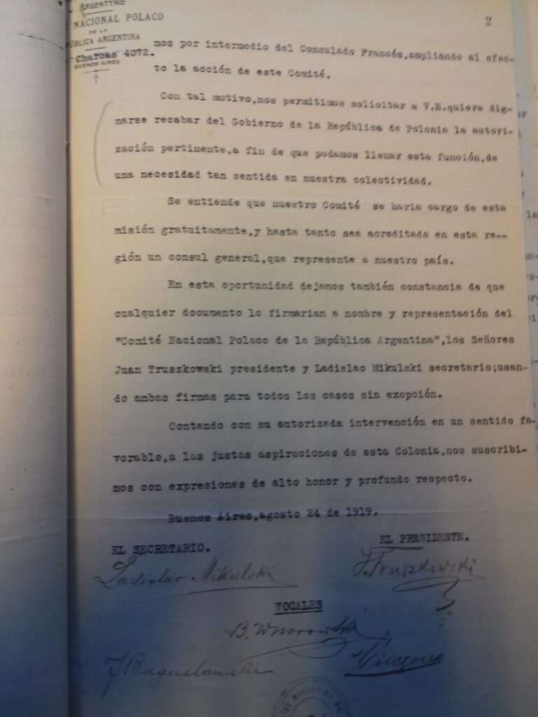 Ante esta realidad, dos organizaciones representativas de la colectividad polaca en la Argentina —la redacción del periódico Słowo Polskie (La Palabra de Polonia), ubicada en calle 345 (actual CABA), y el Comité Nacional Polaco, con sede en Charcas 4072 (CABA)— elevaron una solicitud formal al entonces Ministro de Relaciones Exteriores Argentino, Dr. Honorio Pueyrredón, para que el gobierno argentino gestionara ante el gobierno polaco el otorgamiento de la pertinente autorización para que sus responsables desempeñaran provisoria y gratuitamente las funciones consulares que sus connacionales necesitaban para embarcarse con destino a su patria u obtener un permiso de empleo mediante la tramitación de certificados de nacionalidad en base a la documentación con la que habían llegado a la Argentina.