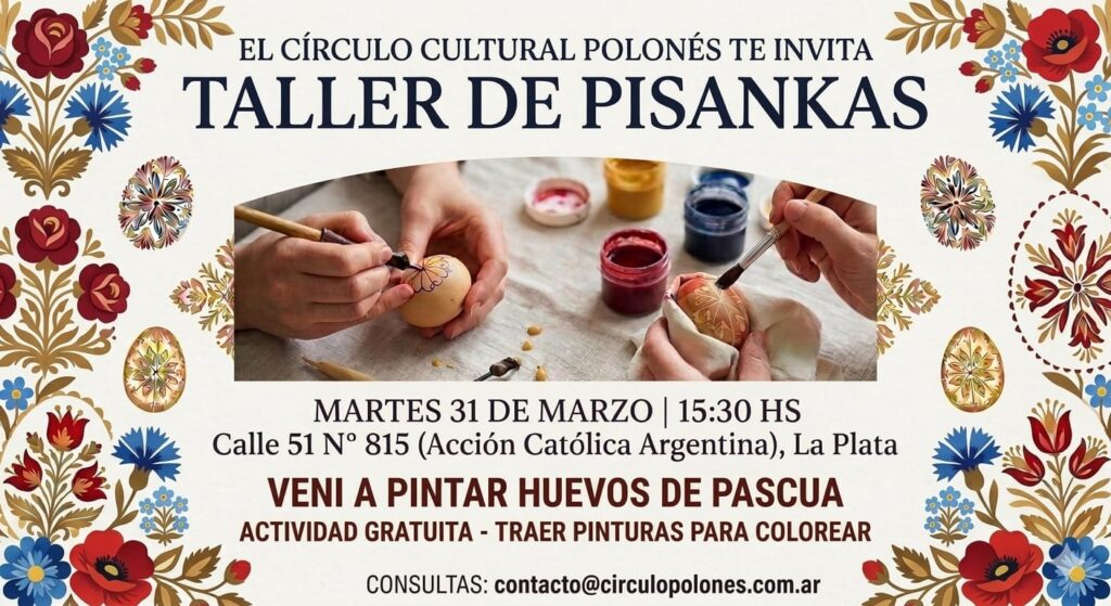 El Círculo Cultural Polonés “San Juan Pablo II” informa la realización de un taller de pintura de pisankas, que tendrá lugar el próximo martes 31 de marzo en la sede de la Acción Católica de La Plata, ubicada en calle 51 N° 815 entre 11 y 12.