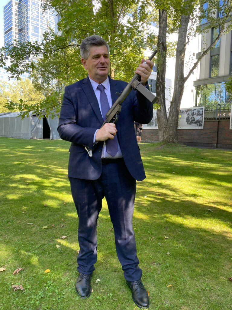 - El autor de la nota Ing. Andrés Chowanczak portando la Pistola Ametralladora Błyskawica.